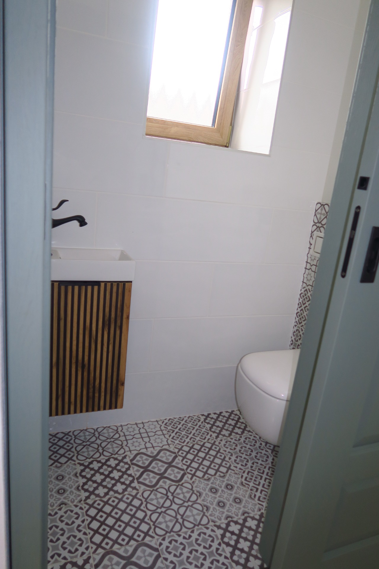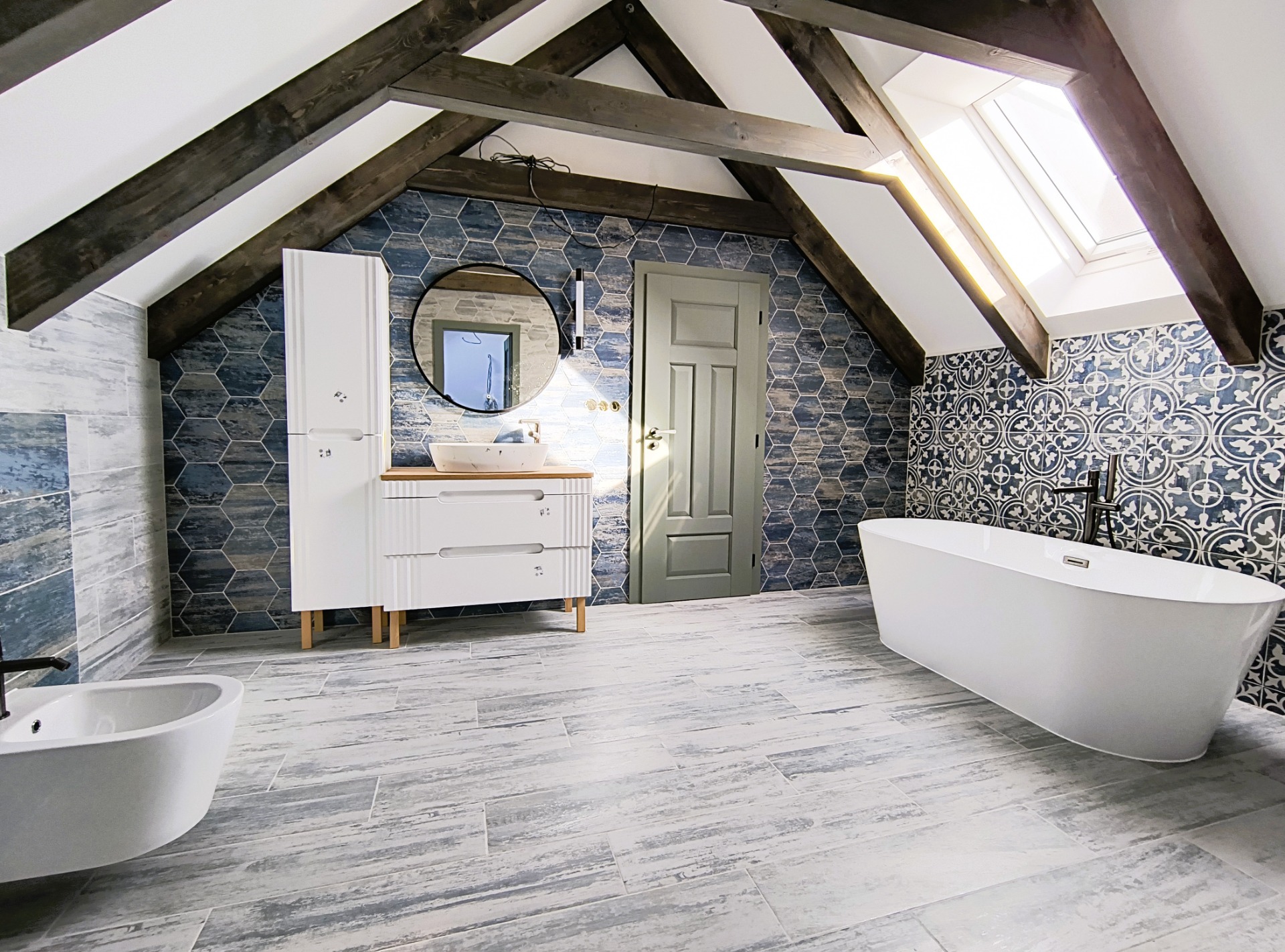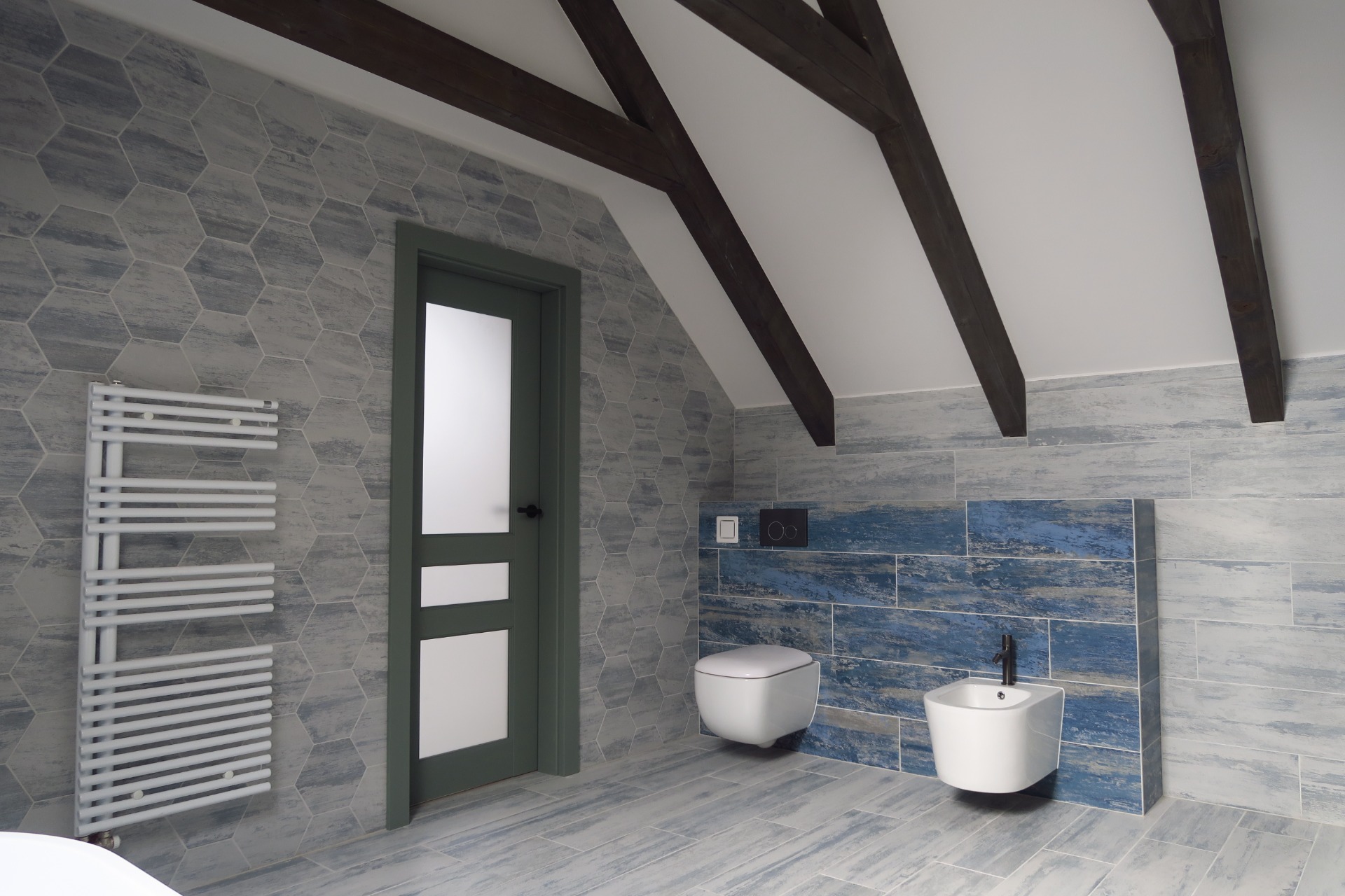 Koupelna s výměrou bezmála 15m2 bude prostorem pro relaxaci. Volně stojící vana 170cm, WC, bidet. Menší místnost vzadu je prádelna.