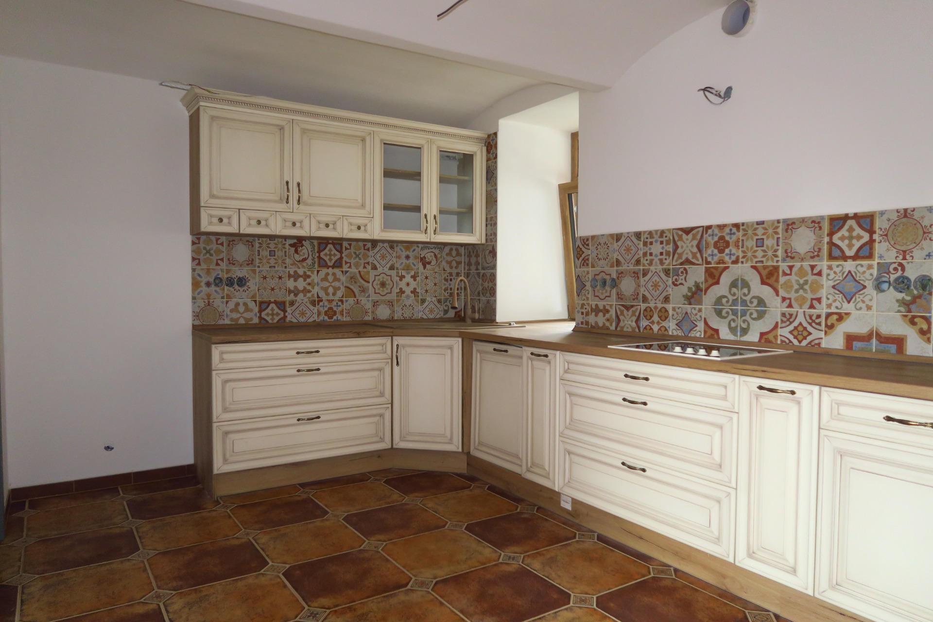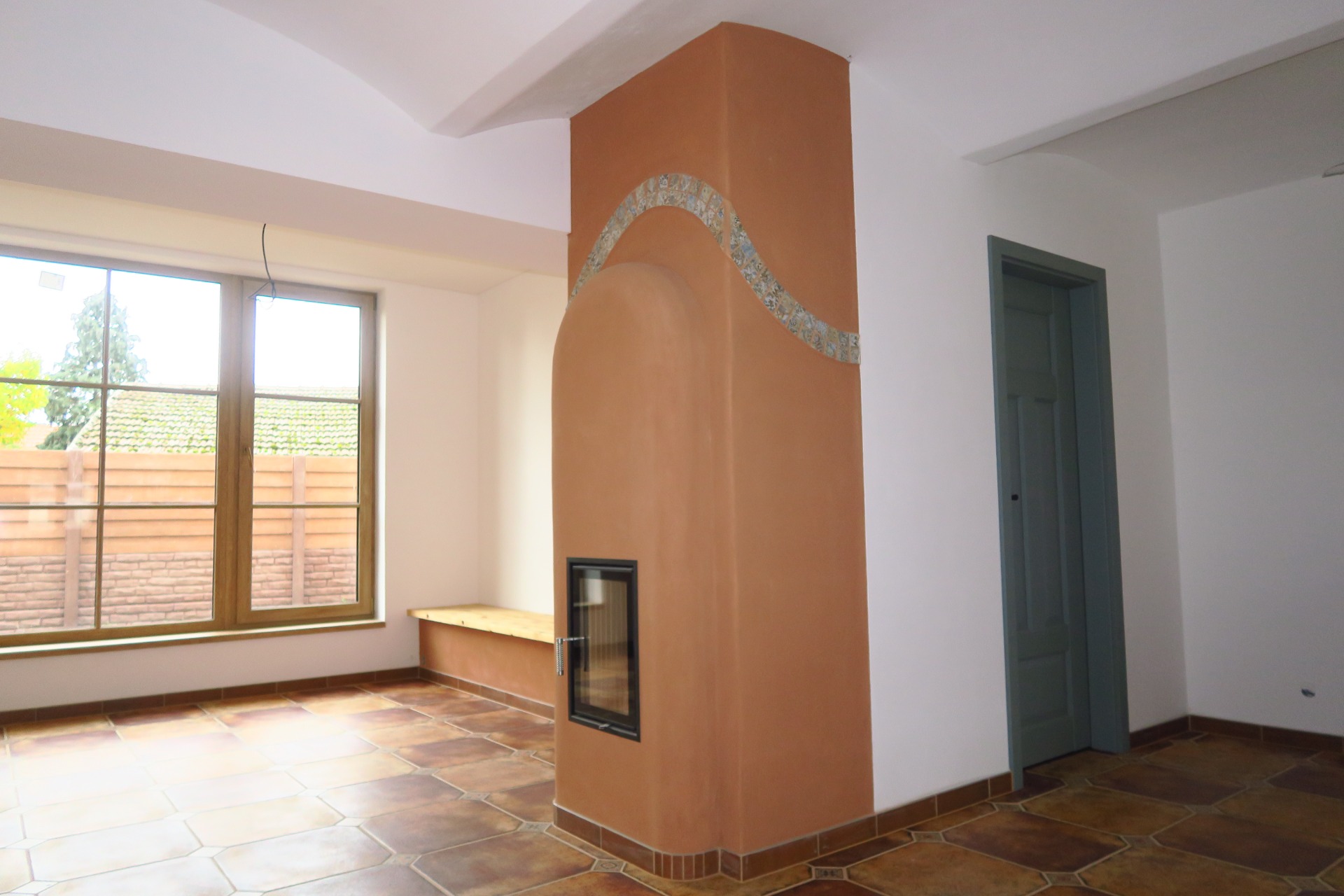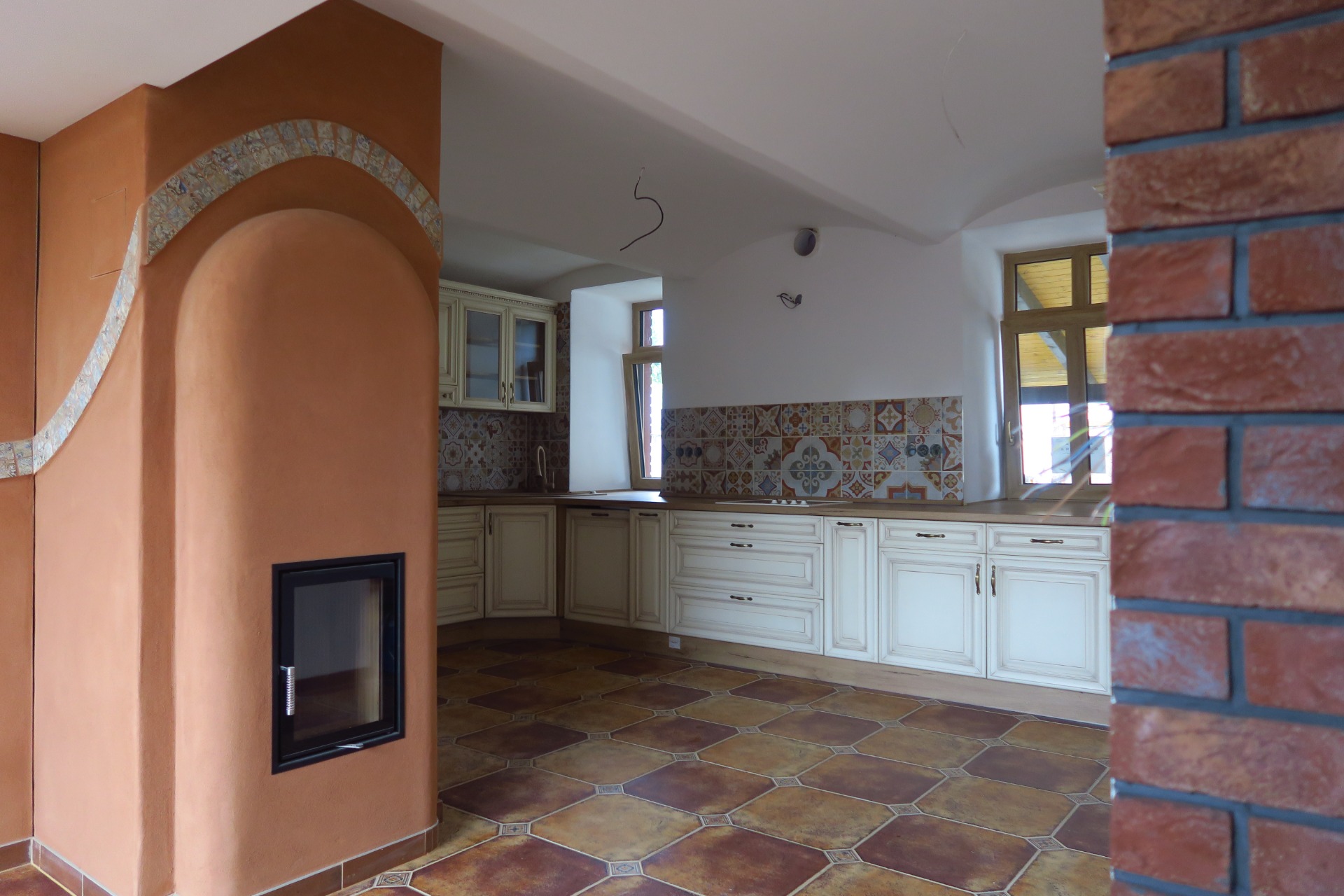 Dominantou v kuchyni spojené s jídelnou jsou sálavá kamna s hliněnou omítkou. I tuto kuchyni zdobí původní klenuté stropy. Kuchyně je zařízena linkou, sklokeramickou deskou a digestoří.