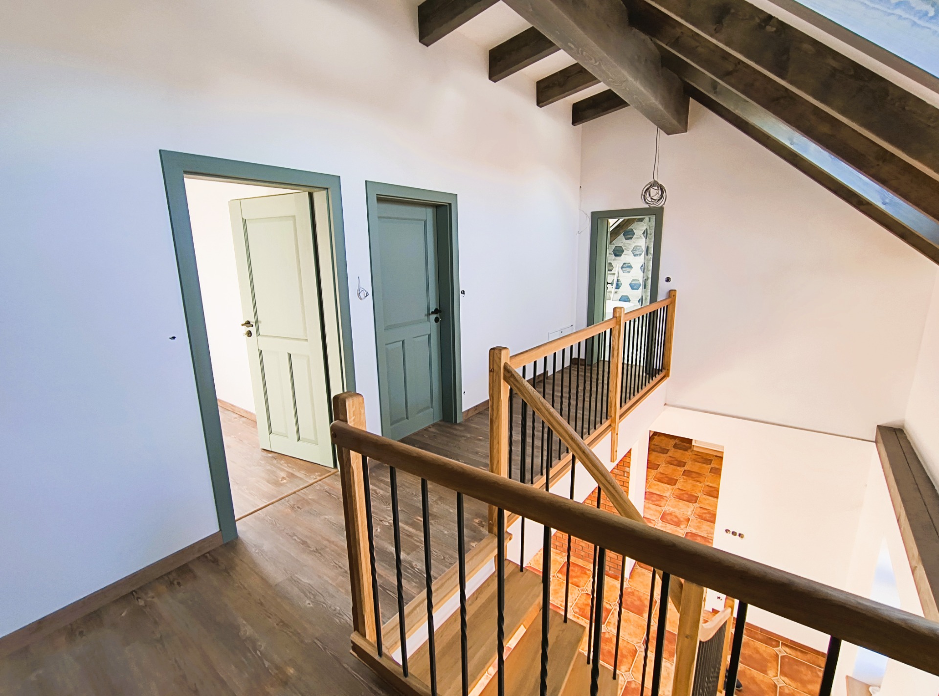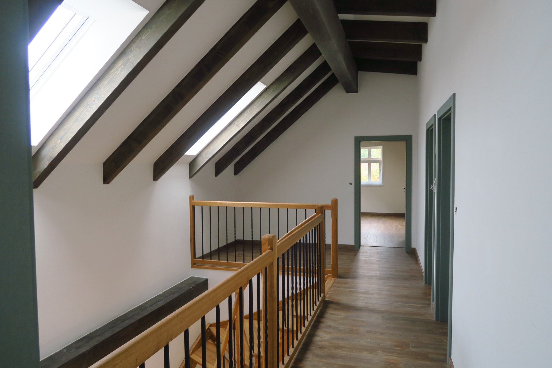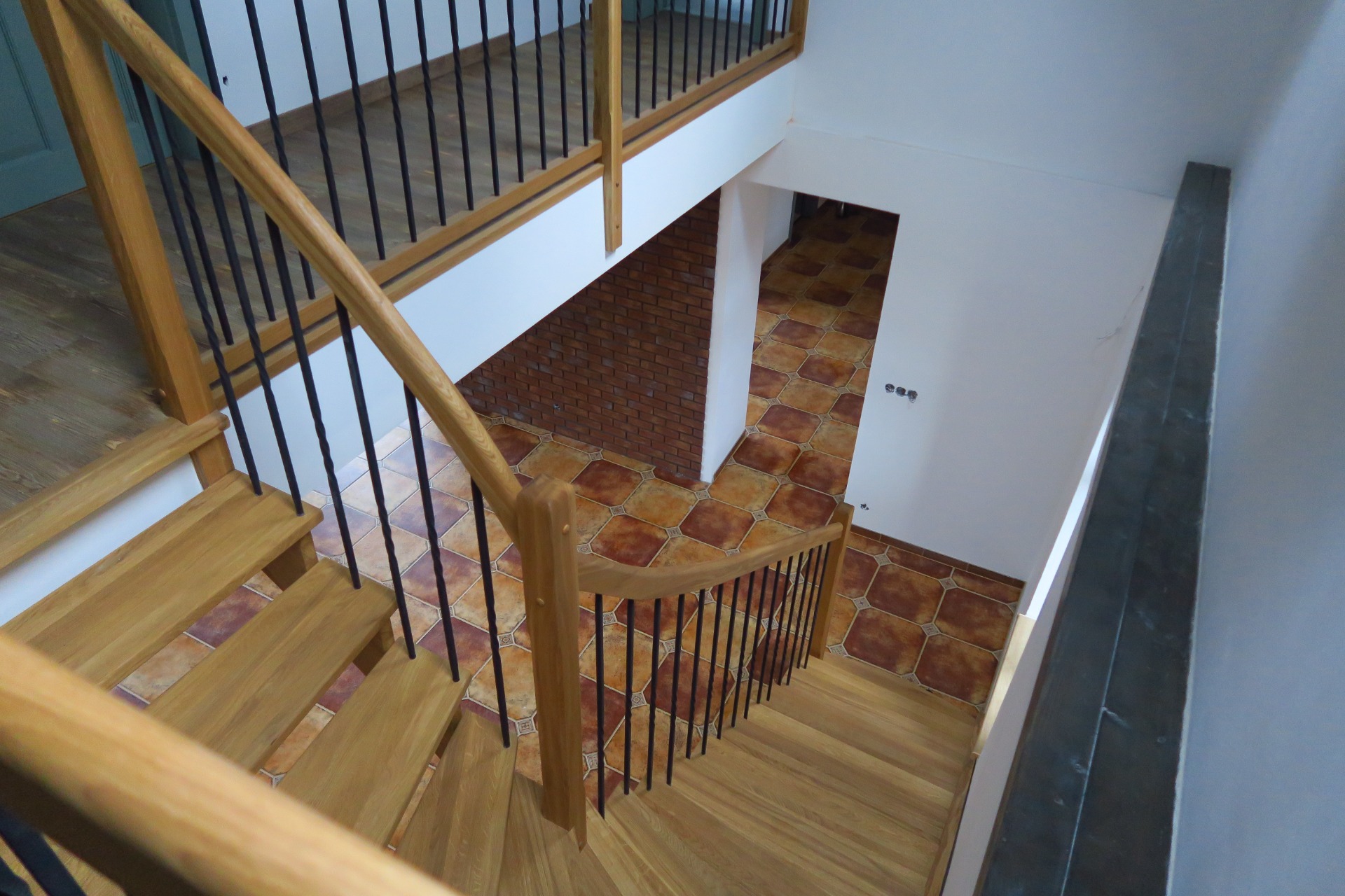 Obě podlaží jsou propojena dřevěným schodištěm s kovanými prvky, odkazujícími na původní využití domu - kovárnu. Střešní okna od severu zajistí dostatek světla, avšak nepřehřívají prostor.